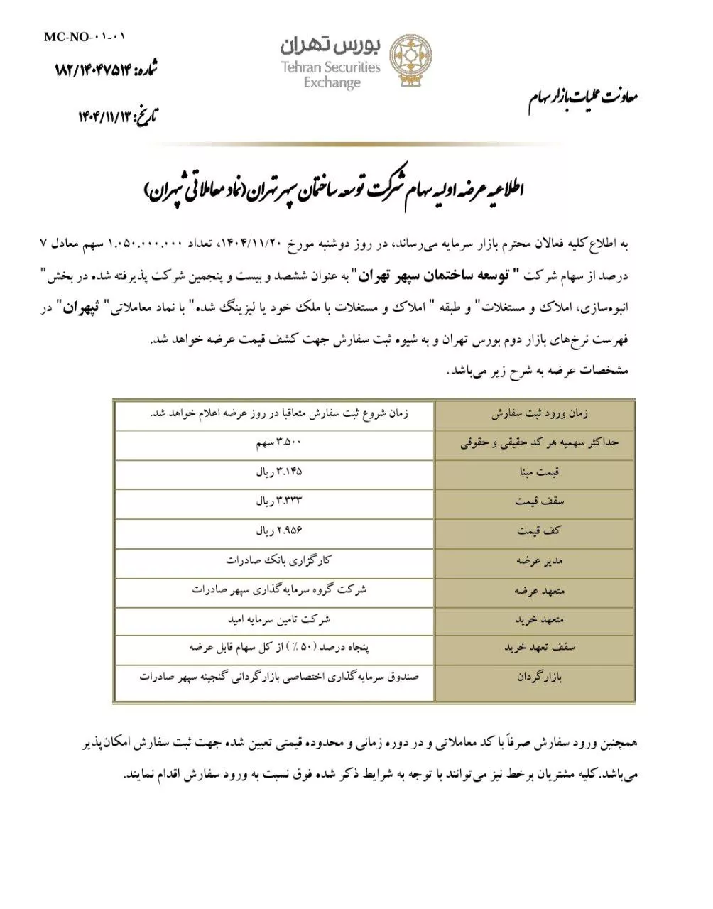 ‼️عرضه اولیه سهام شرکت توسعه ساختمان سپهر تهران