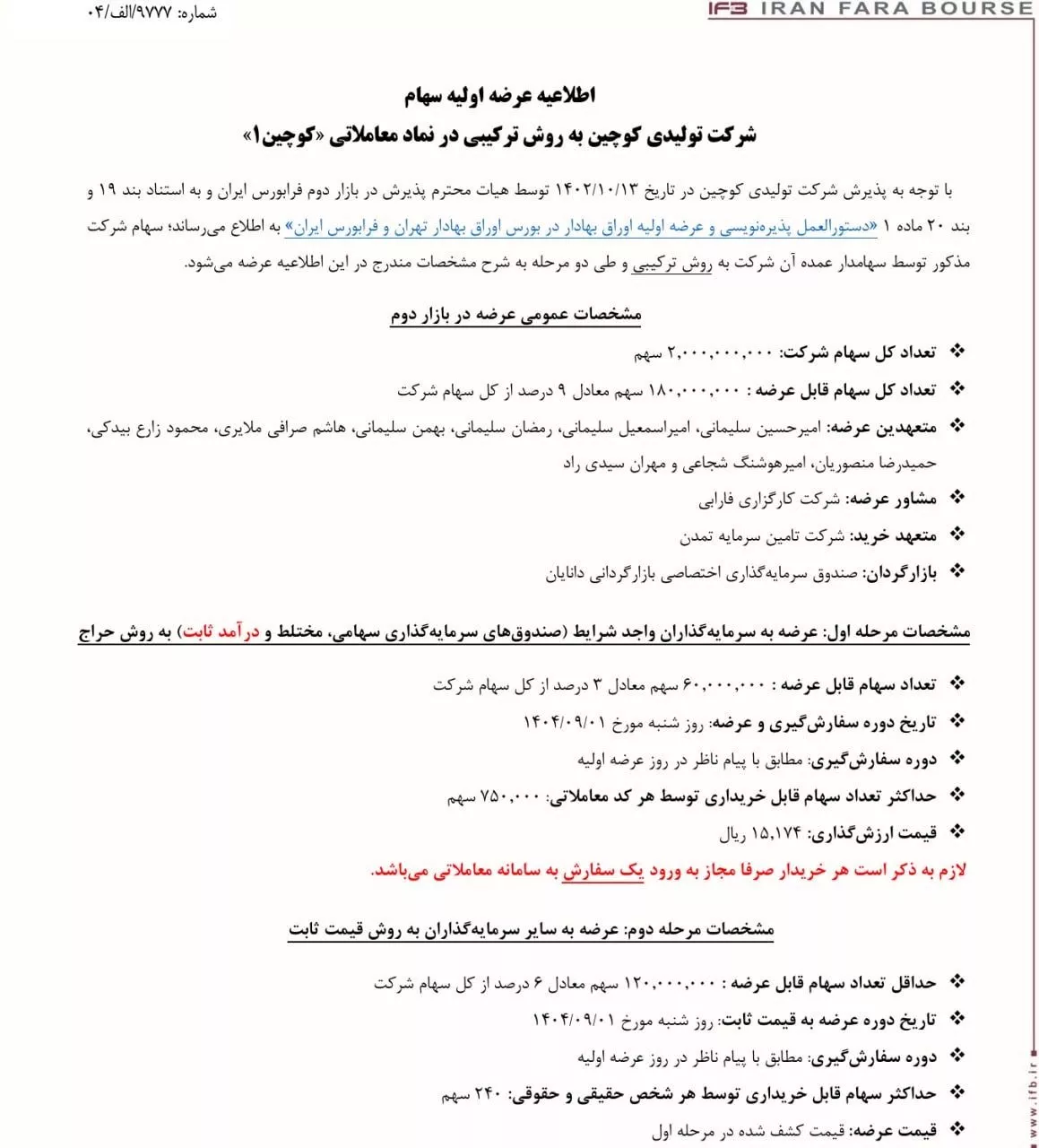 #اطلاعیه| عرضه اولیه سهام شرکت تولیدی کوچین به روش ترکیبی در فرابورس ایران