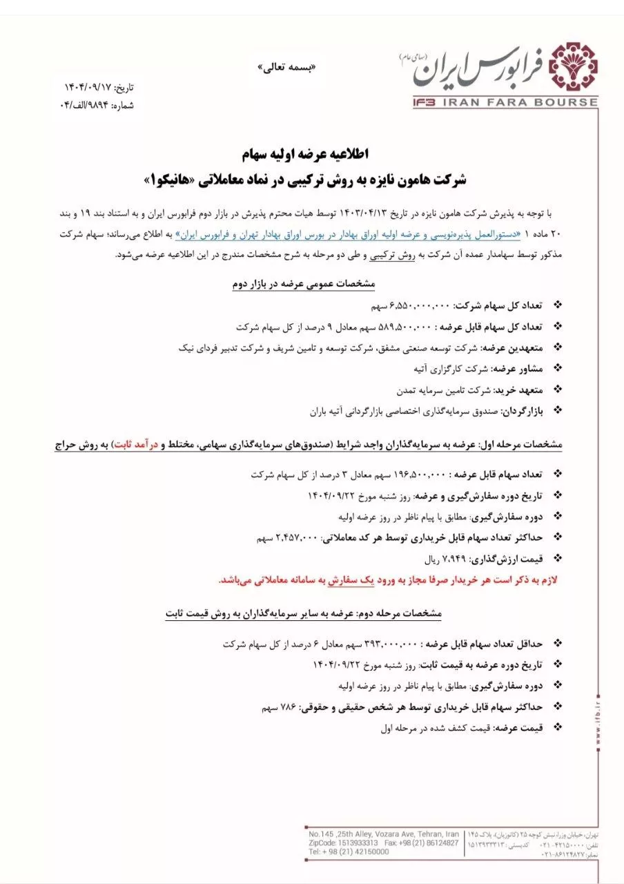 عرضه اولیه سهام شرکت هامون نایزه به روش ترکیبی در نماد معاملاتی «هانیکو1»