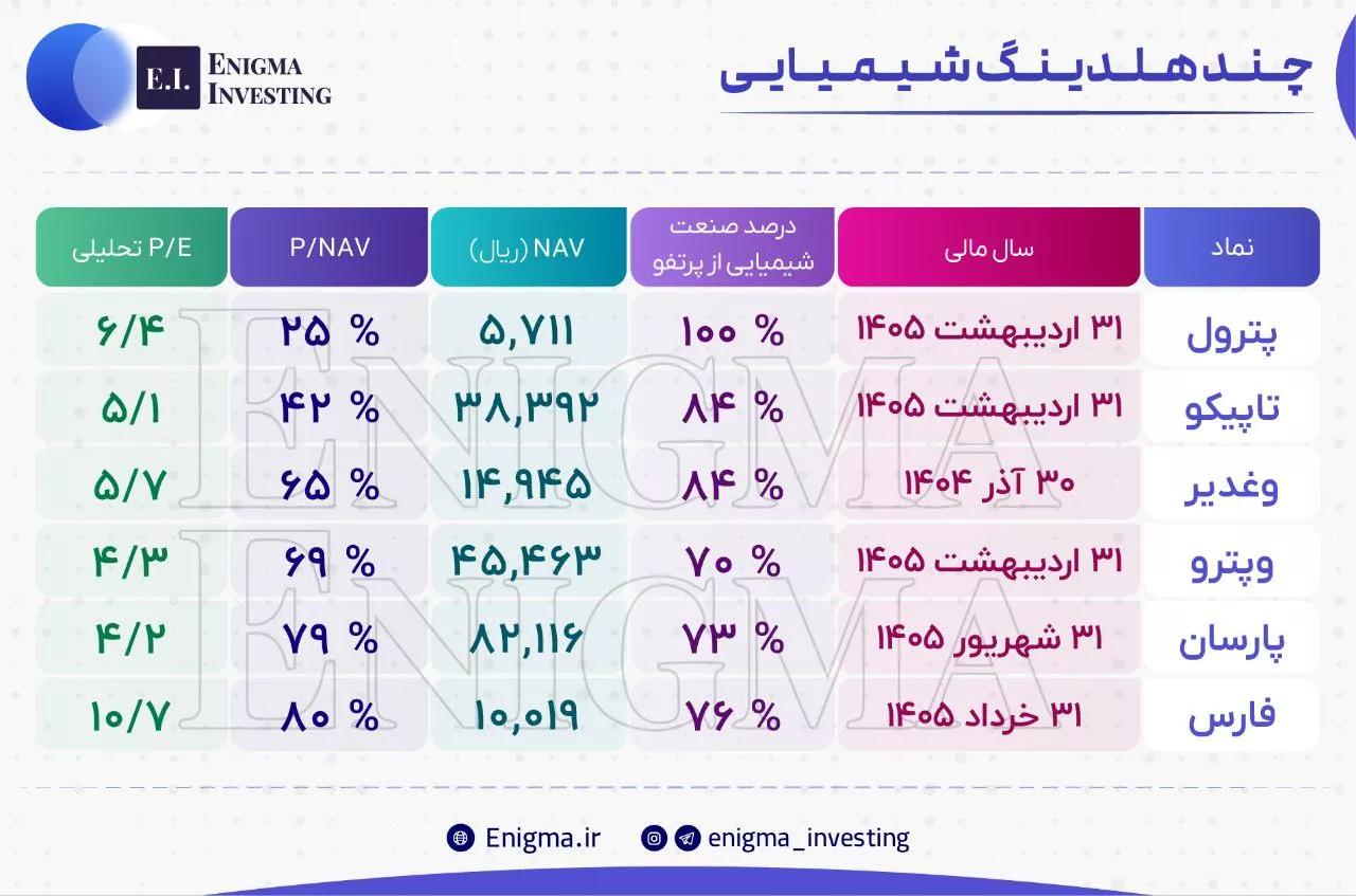 ✅ با توجه به وضعیت مثبت بازار سرمایه و صنعت محصولات شیمیایی، در این پست به بررسی چند هلدینگ از این صنعت پرداختیم، در این بررسی ابتدا سال مالی این شرکتهای بررسی شد، سپس درصد محصولات شیمیایی از سبدشان، NAV این شرکتها و در نهایت دو پارامتر مهم P/NAV و P/E تحلیلی (مربوط به سال مالی ذکر شده) بررسی شدند.