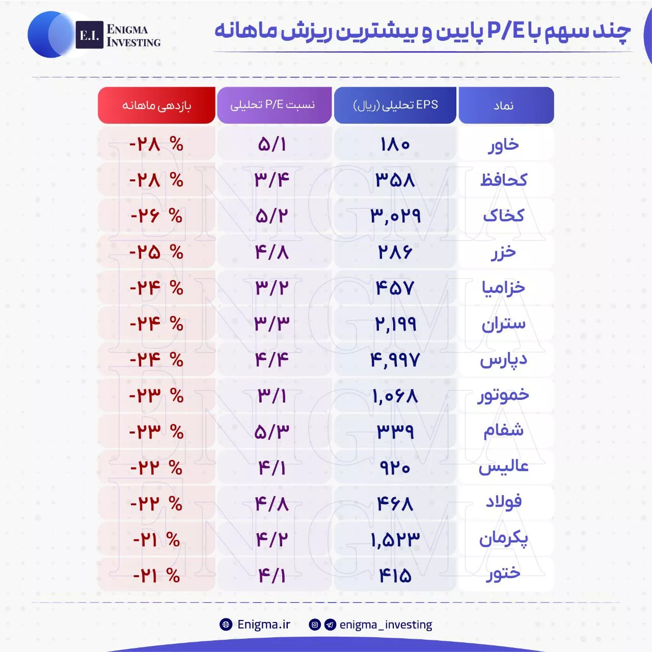 🔵 چند سهم با P/E پایین و بیشترین ریزش ماهانه 🔵