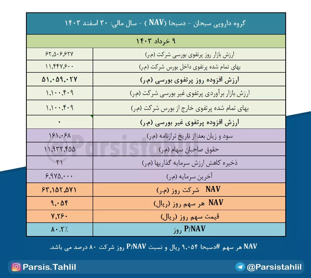 بدین ترتیب NAV هر سهم #دسبحا 9054 ریال و نسبت P/NAV روز شرکت 80 درصد می باشد.