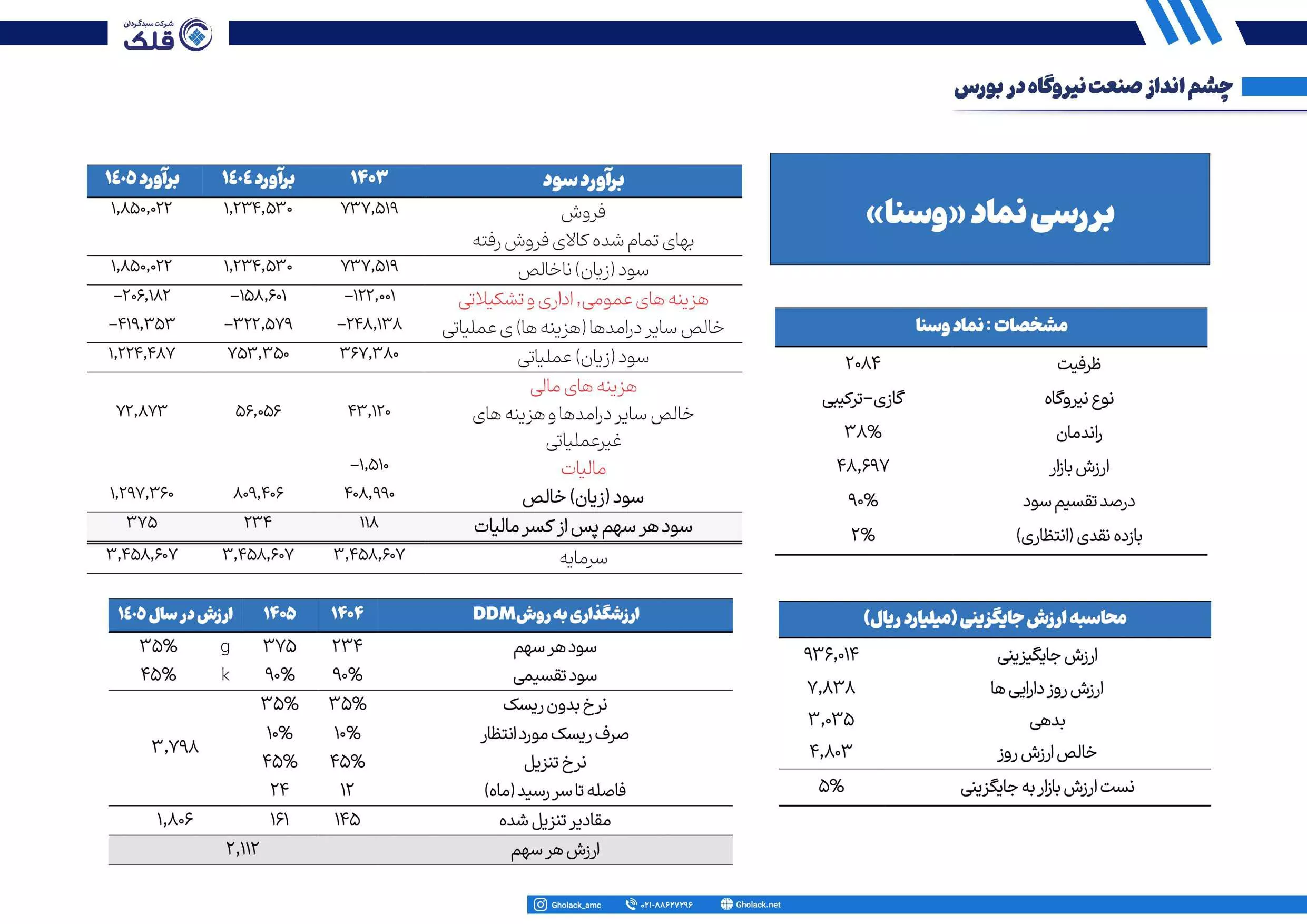🔸 در نهایت با مقایسه ارزش جایگزینی شرکتهای تولیدکننده برق و سرمایه گذاریهای نیروگاهی، ضمن بررسی ارزندگی "سرمایه گذاری نیروگاهی ایران (وسنا)"، دلایل پایین بودن ارزش بازار این شرکت مورد مداقه قرار گرفته است.