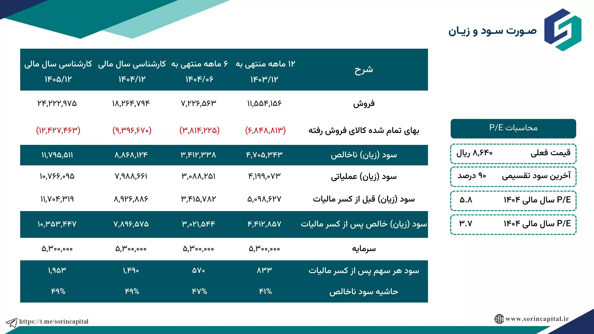 📊 ارزش بازار سخاش برابر با ۳۱.۴۸۰ میلیارد ریال و آخرین قیمت سهم ۵.۹۴۰ ریال است. با فرض تقسیم سود ۹۵٪ (مشابه سال گذشته) P/E تحلیلی سال ۱۴۰۴ برابر با ۴.۲ خواهد بود.