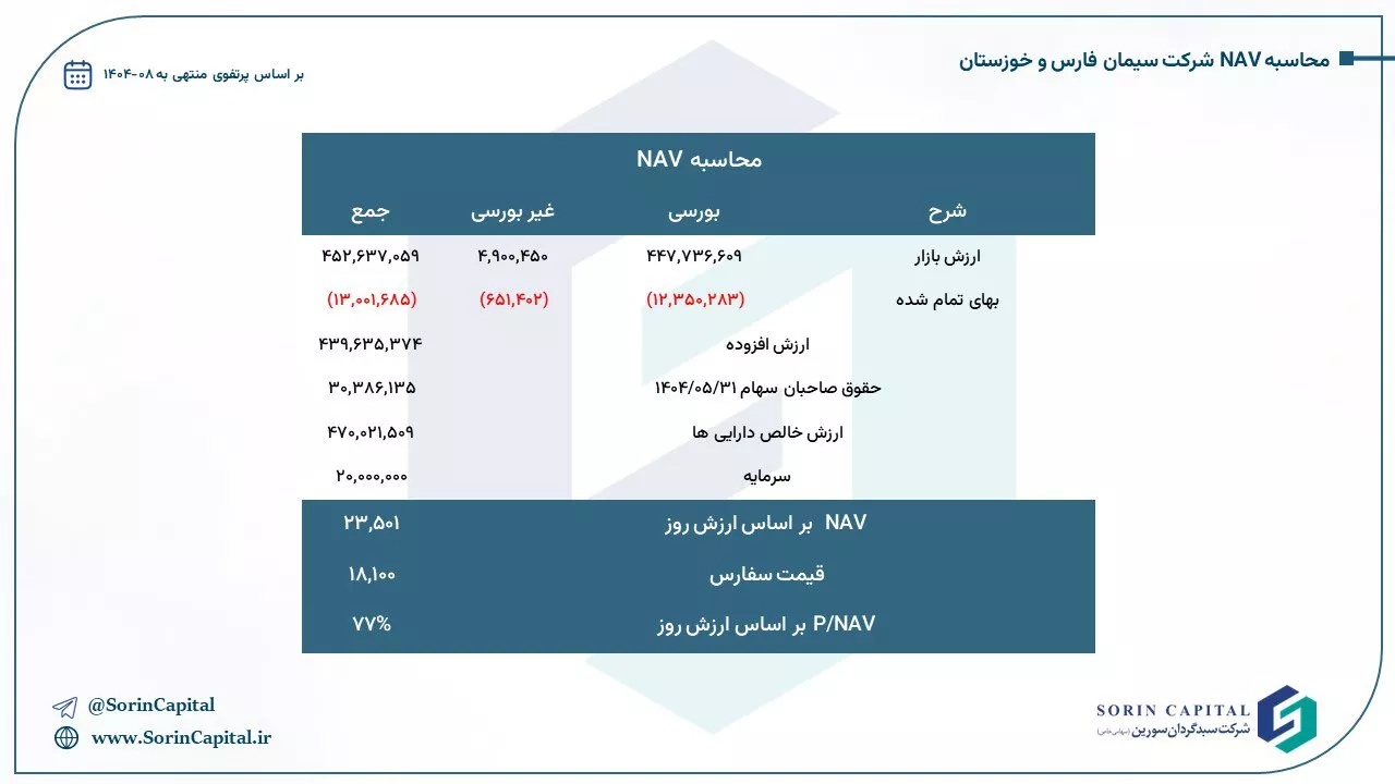 بدین ترتیب NAV هر سهم #سفارس 45496 ریال و نسبت P/NAV روز شرکت 77 درصد می باشد.