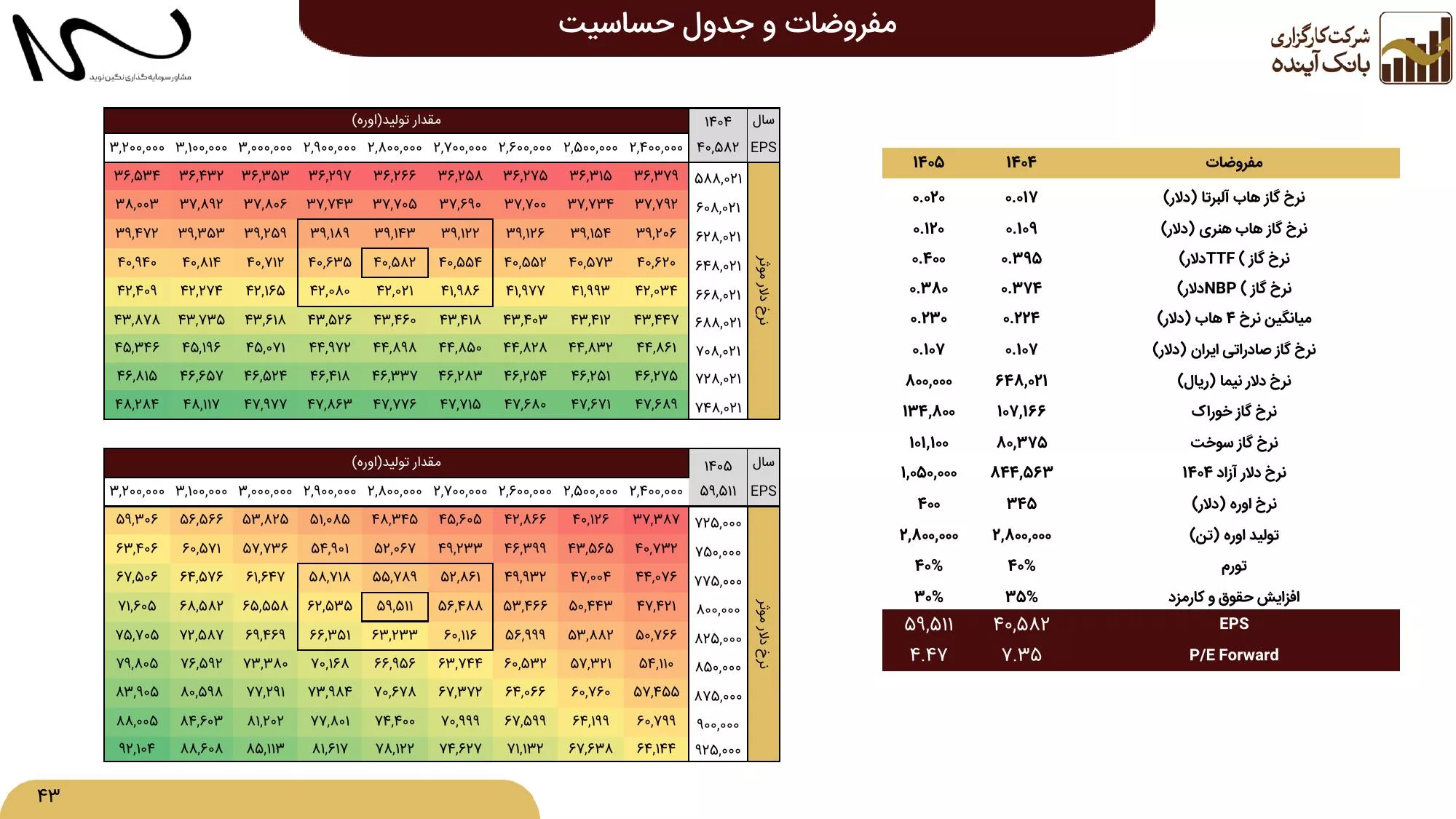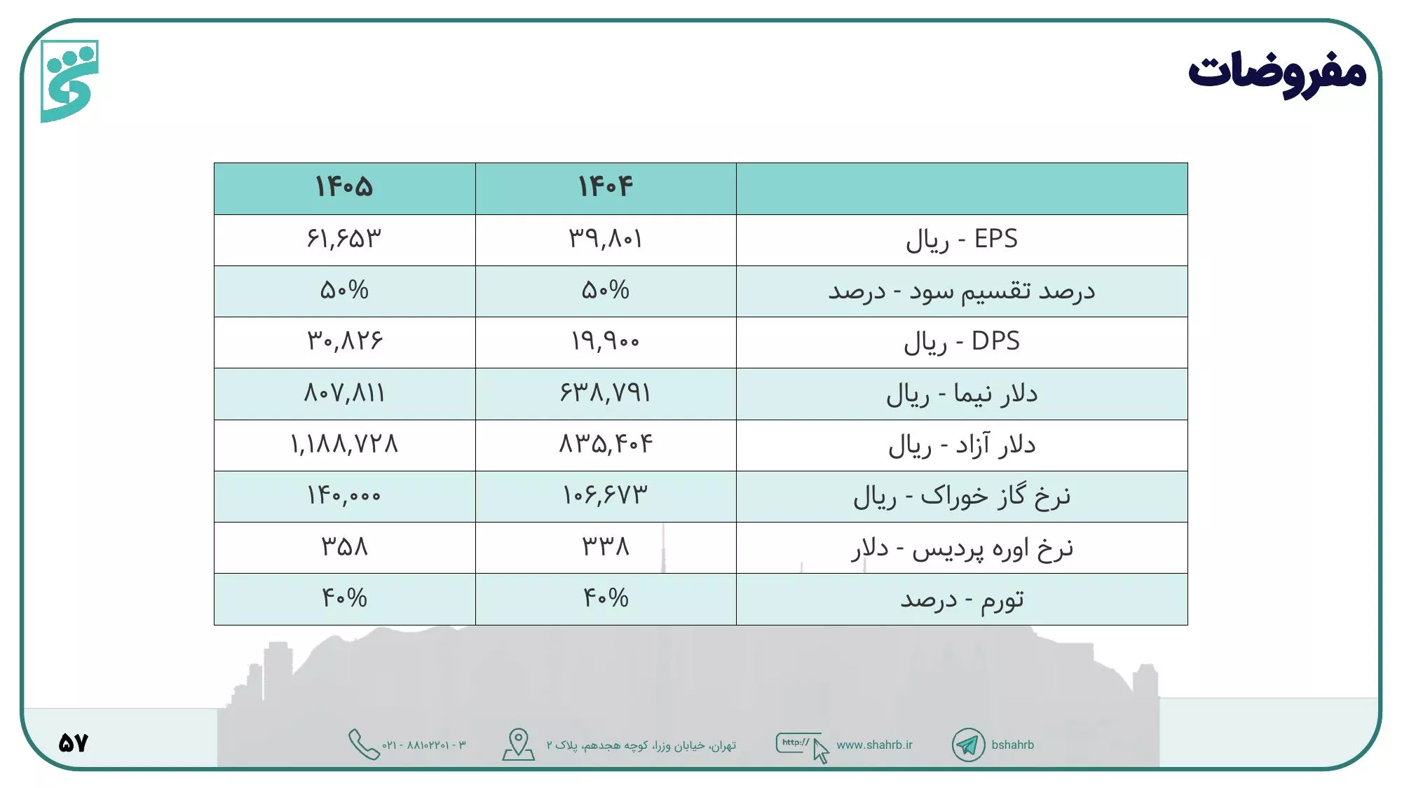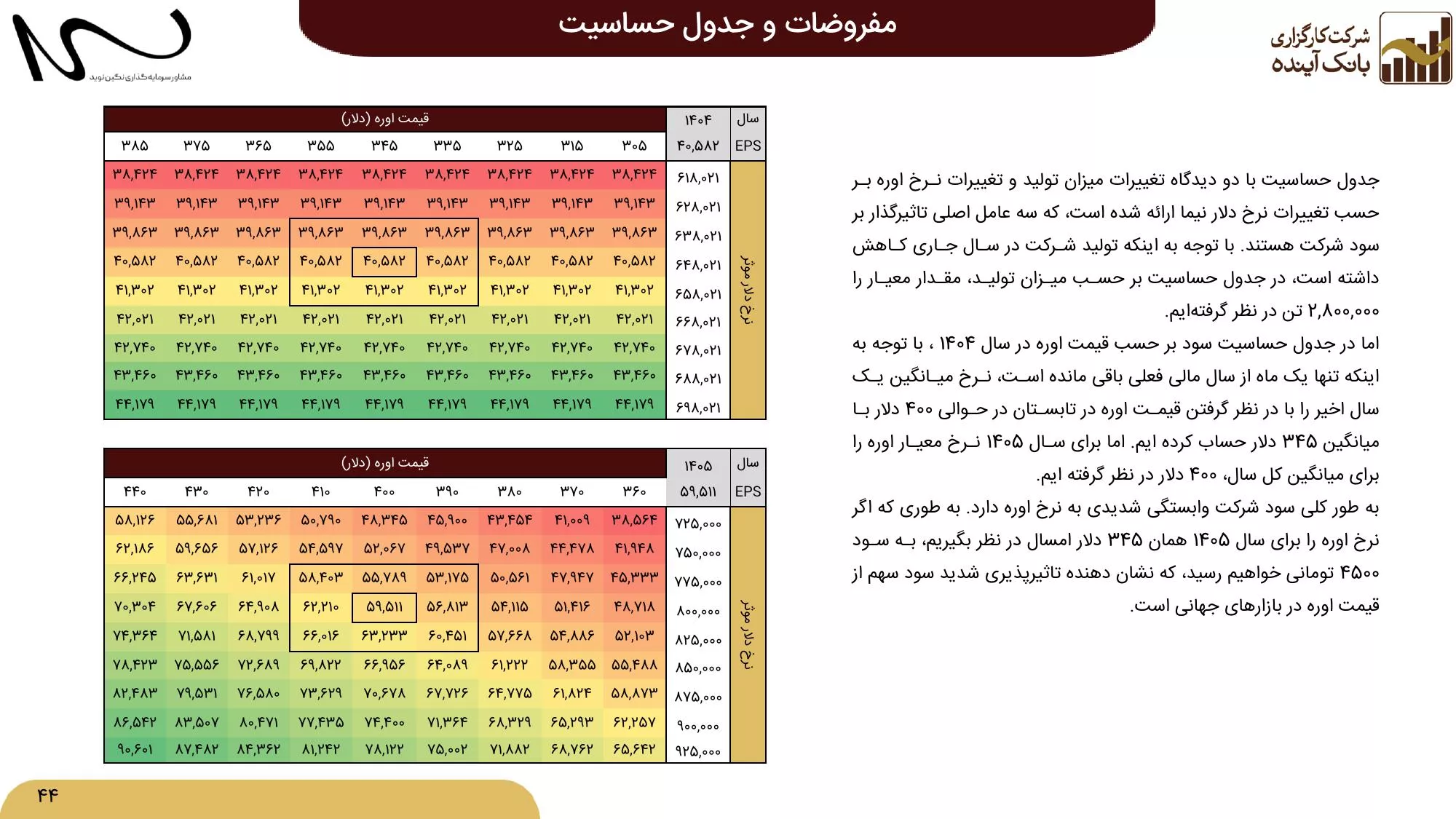 🔘در پیشبینی سال مالی منتهی به ۱۴۰۵، با مفروضات کاهش تولید به ۲.۵ میلیون تن، نرخ گاز خوراک ۱۶.۵ سنت، نرخ اوره صادراتی ۳۵۰ دلار به ازای هر تن و نرخ دلار نیما ۸۳ هزار ریال، انتظار میرود محدودیتهای تأمین گاز خوراک در فصول سرد اثر محسوسی بر فروش و سودآوری بگذارد.