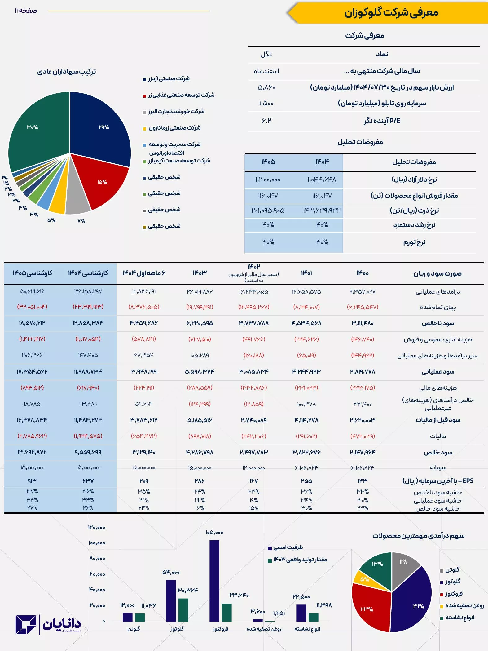 در گزارش فوق به بررسي شركت گلوگوزان(غگل) پرداخته ايم. محصولات عمده ي شركت توليدات مشتقات ذرت مي باشد. با توجه به برگزاري مجمع فوق العاده و تغيير اساسنامه شركت، سال مالي شركت از اول فروردين تا آخر اسفند لحاظ گرديده است از اين رو تمامي مفروضات و محاسبات بر اساس اخرين تغييرات شركت مورد بررسي قرار گرفته است.