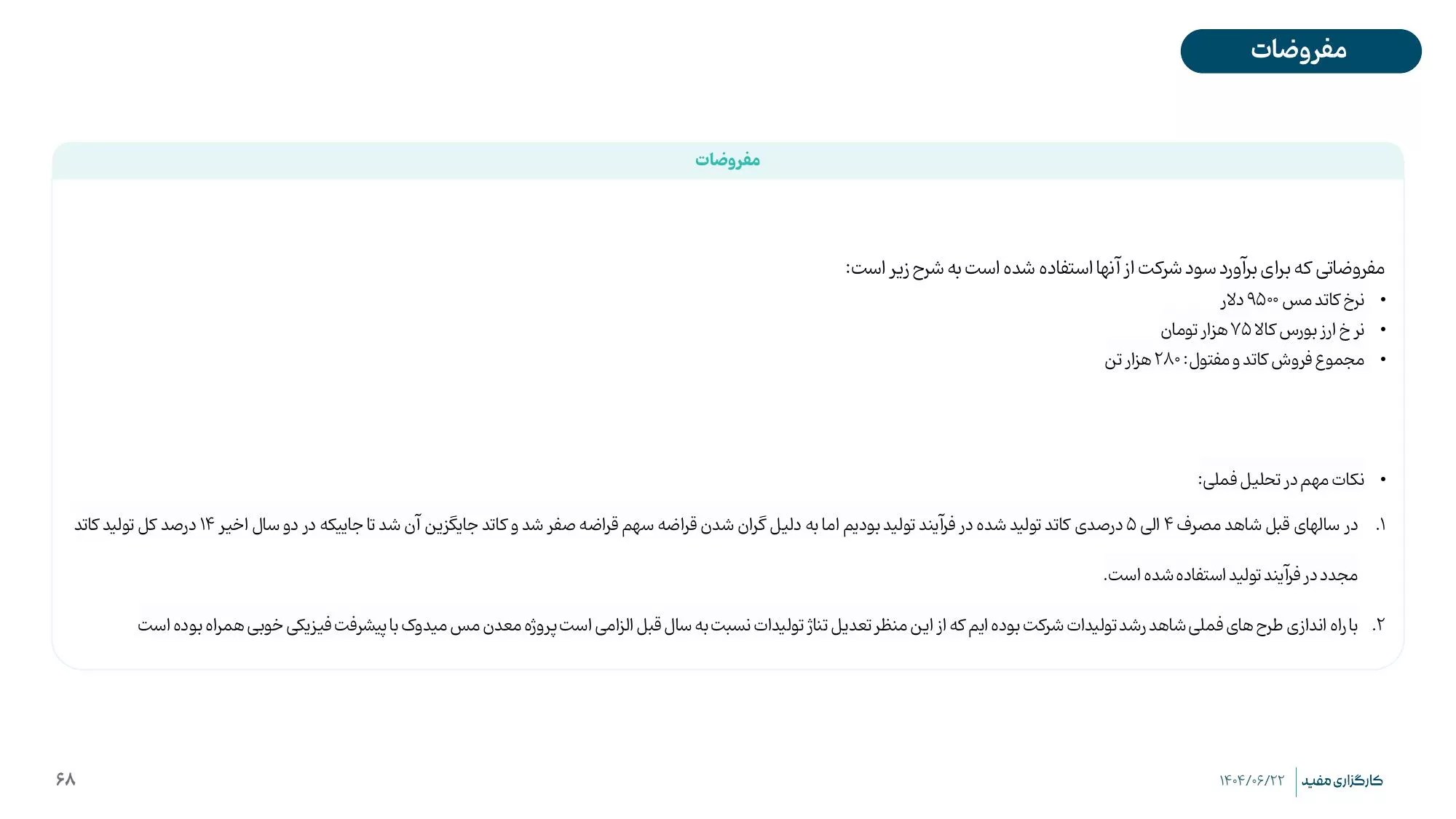 🔗 در تصویر بالا چکیدهای از تحلیل بنیادی فملی را بهعنوان یکی از بزرگترین شرکتهای تولیدی مس در آسیا و خاورمیانه مشاهده میکنید.