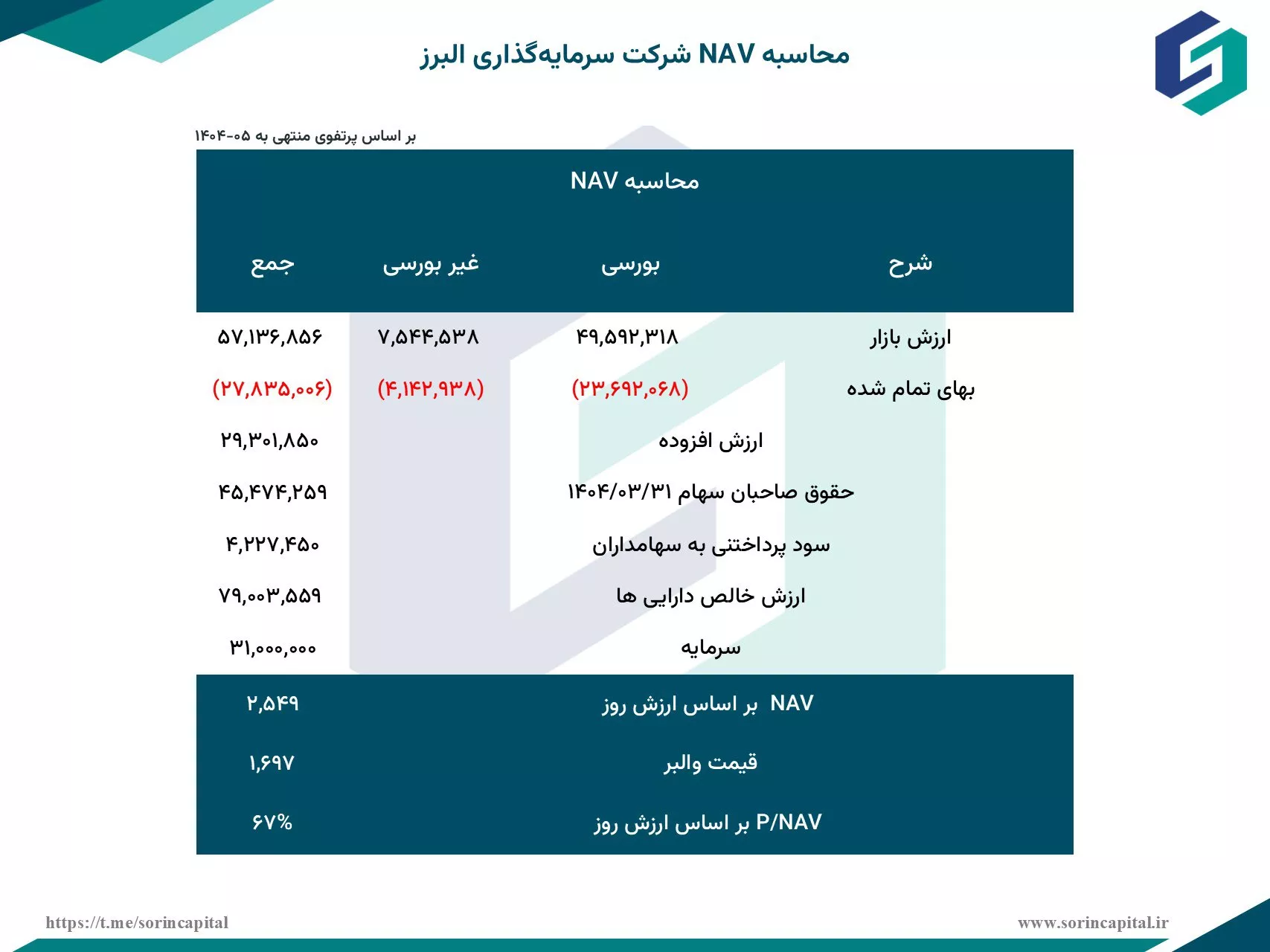 بدین ترتیب NAV هر سهم #والبر 7,879 ریال و نسبت P/NAV روز شرکت 70 درصد می باشد.