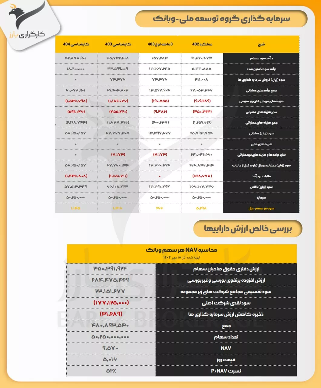 بدین ترتیب NAV هر سهم #وبانک 9,810 ریال و نسبت P/NAV روز شرکت 54 درصد می باشد.