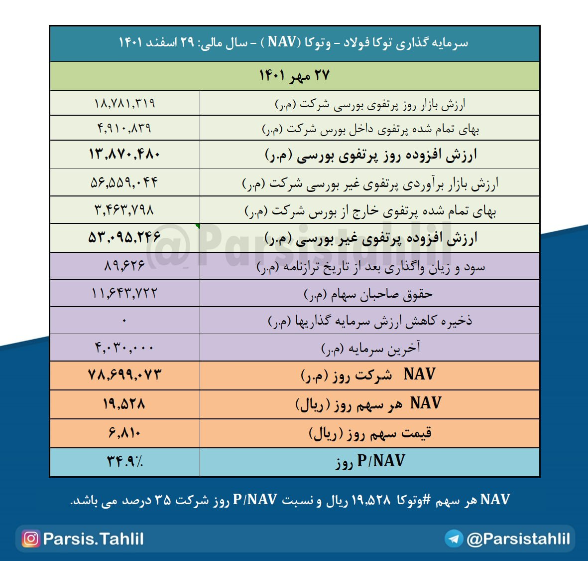 بدین ترتیب NAV هر سهم #وتوکا 19,528 ریال و نسبت P/NAV روز شرکت 35 درصد می باشد.