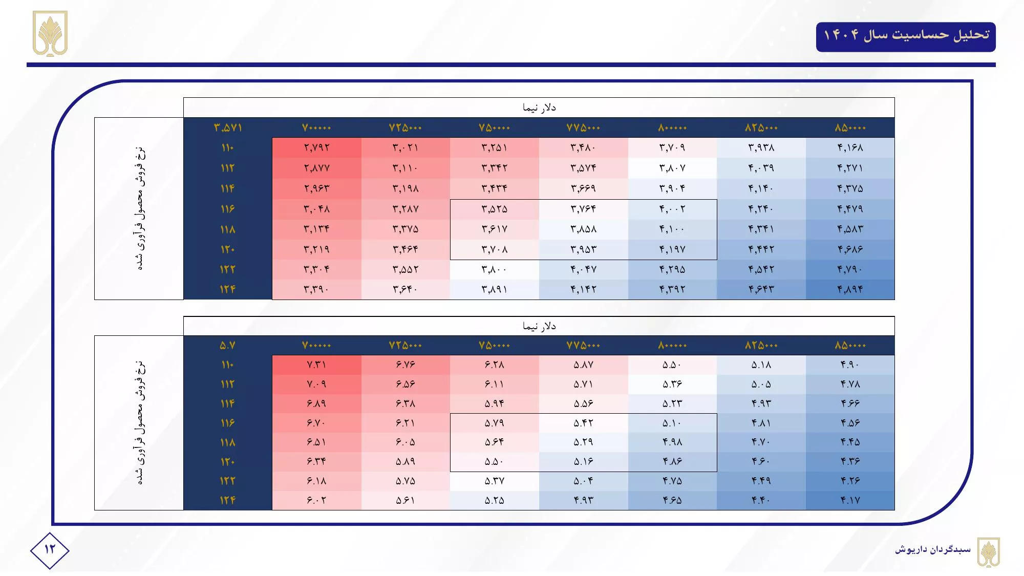تحلیــل حساســیت "نــرخ فــروش بلــوک گازی" و "نــرخ فــروش کائولــن فــرآوری شــده" در جــدول زیــر ارائــه شــده اســت. در ایــن جــدول نــرخ فــروش پانــل گازی و مــات خشــک و همچنیــن نــرخ فــروش کائولــن درجه بنــدی شــده متناسب ســازی شــده اســت.