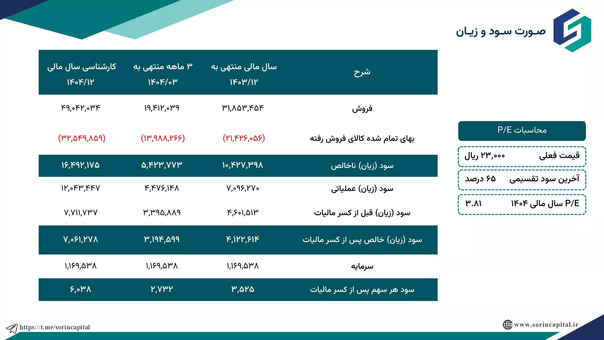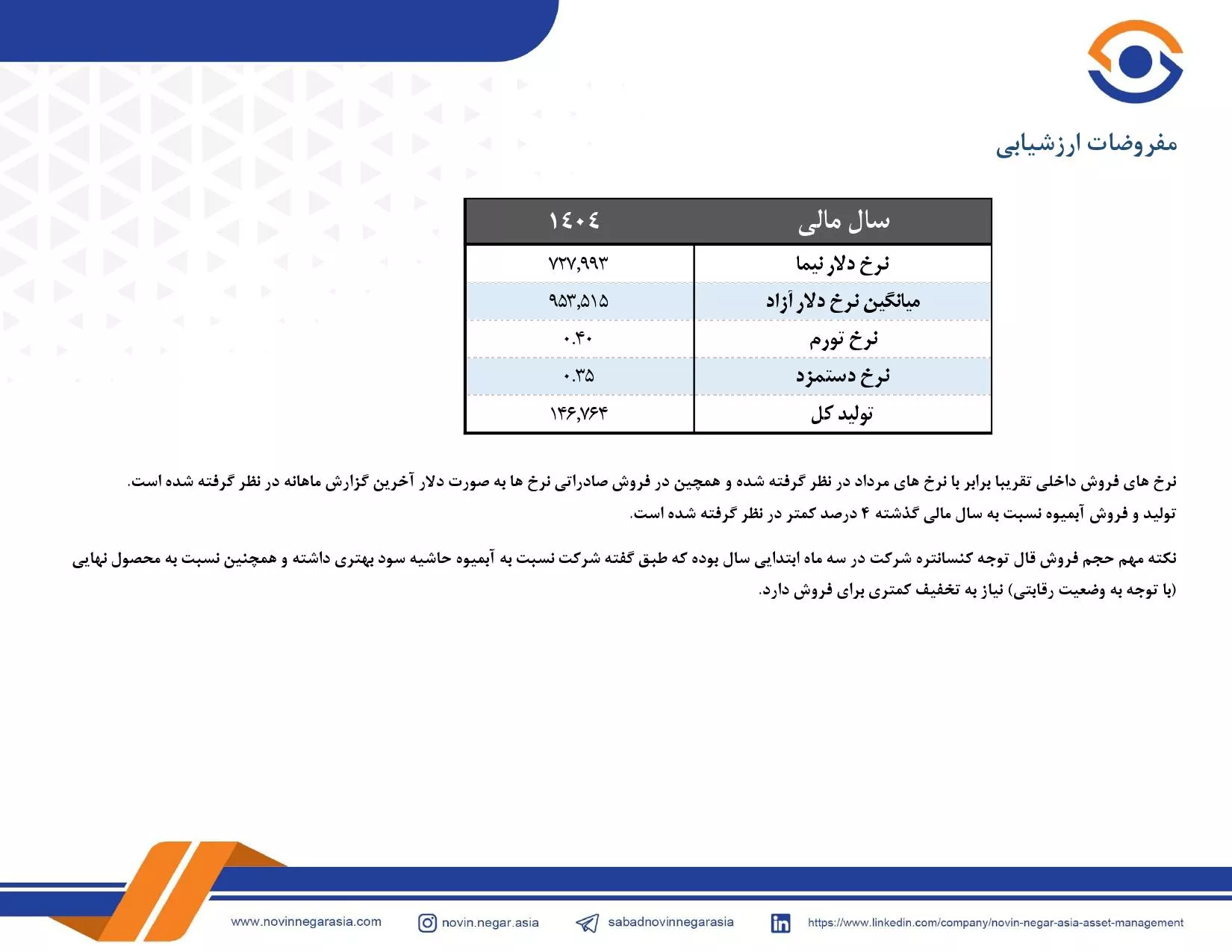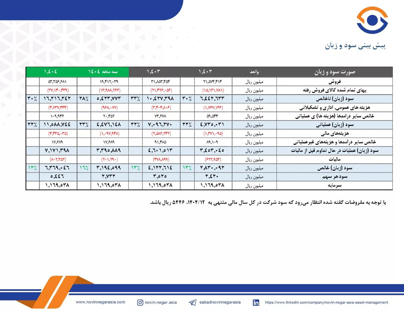 شرکت در گزارشات ماهانه سال جاری عملکر خوبی داشته و در سه ماههی سال جاری حدود 1.9 همت فروش داشته که این رقم در سال مالی 1403، 3.1 همت بوده است. با توجه به مفروضات ذکر شده در گزارش فوق برای سال 1404 سود هر سهم شرکت حدود 570 تومان برآورد میشود و p/e فروارد 4.5 به شرکت تعلق میگیرد.