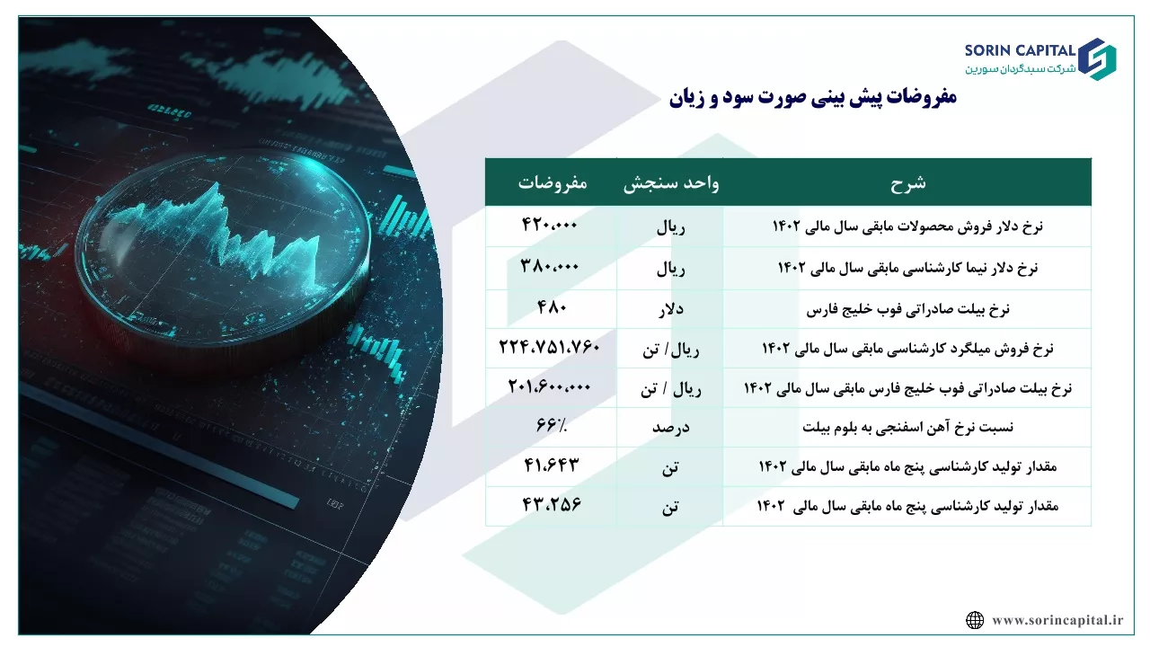 فرود در سال 1403 با دلار مفروضات مطرح شده 1015 ریال سود خواهد داشت. ظرفیت به تولید برای سال سال مورد پیش بینی 43 درصد از 200 هزار تن شمش در نظر گرفته شده است.