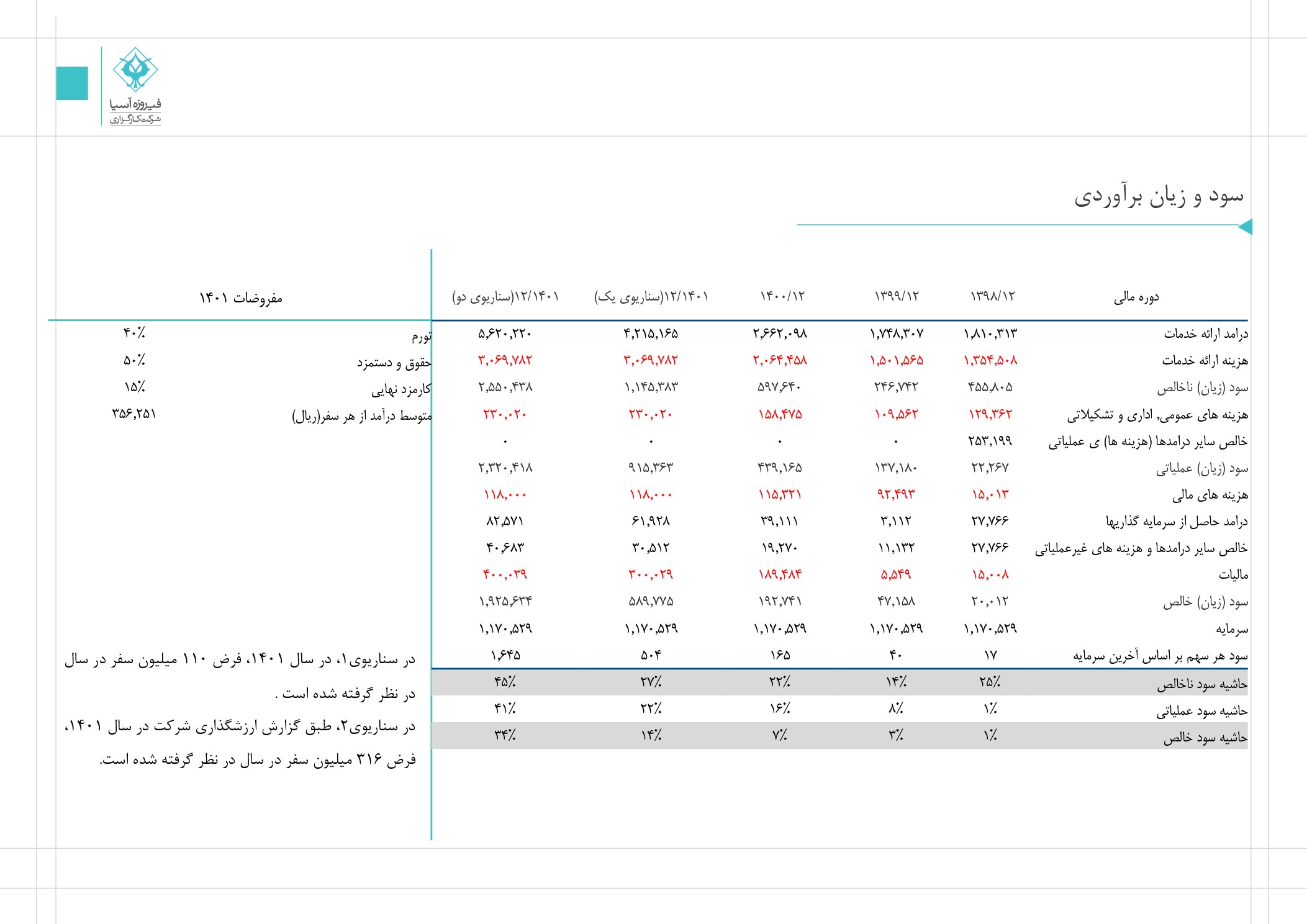📍درآمد فروش در 9 ماهه باقی مانده در سال جاری معادل میانگین درآمد در 3 ماه اخیر لحاظ شده و برای دستمزد و سایر هزینه ها به ترتیب رشدی معادل %40 و %30 اعمال شده است.