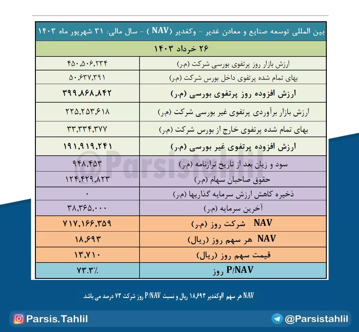 بدین ترتیب NAV هر سهم #وکغدیر 18,693 ریال و نسبت P/NAV روز شرکت 73 درصد می باشد.