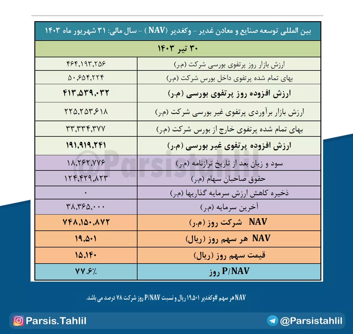 بدین ترتیب NAV هر سهم #وکغدیر 19,501 ریال و نسبت P/NAV روز شرکت 78 درصد می باشد.